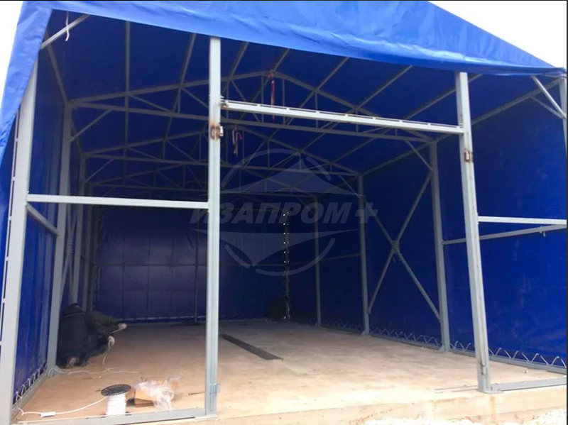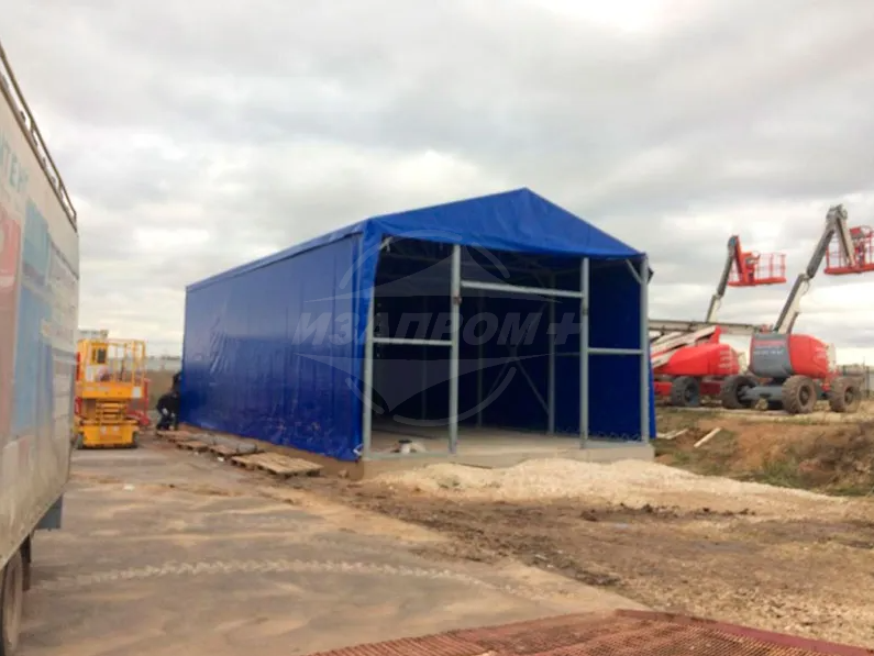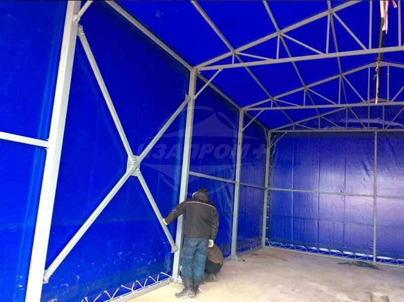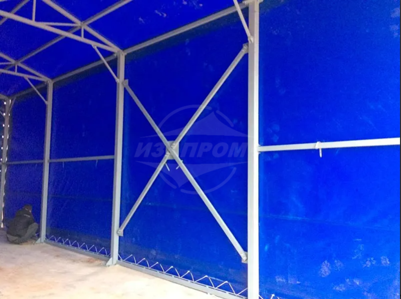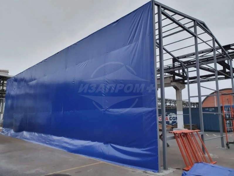 Изготовление тента для ангара размером 12х6,5х5 Полезная площадь покрытия ангара 217 м². Тентовая кровля представляет собой оболочку из полиэфирного материала, пропитанного поливинилхлоридом (ПВХ) и обработанного акриловым лаком.